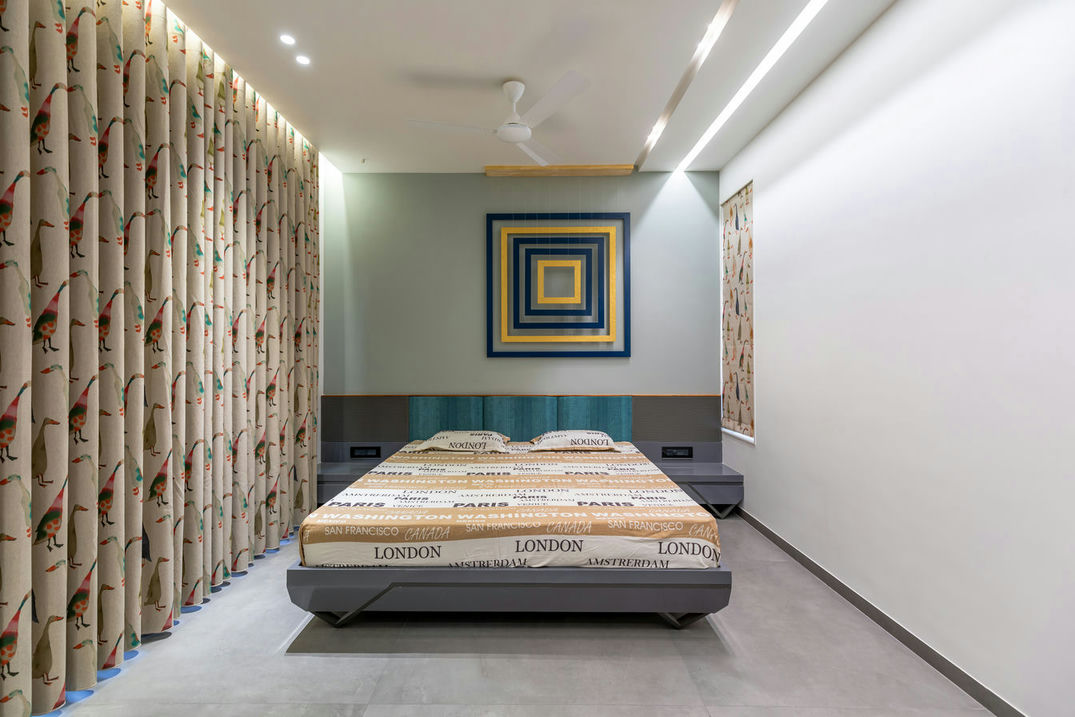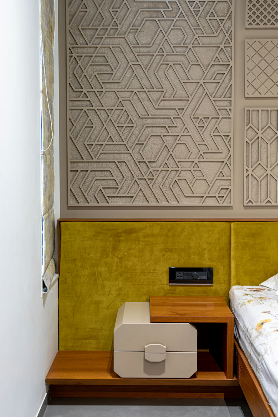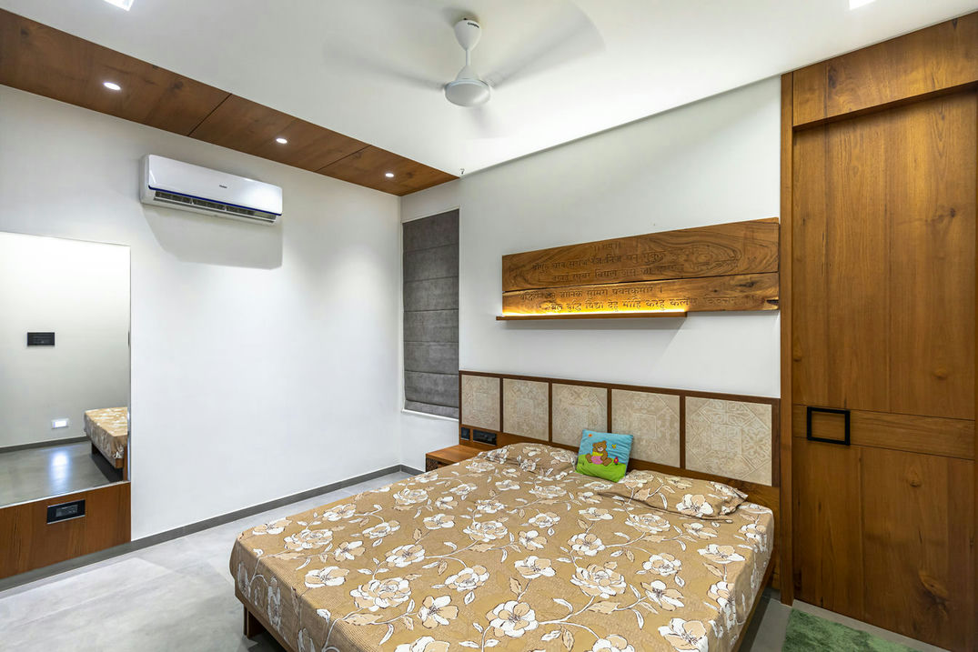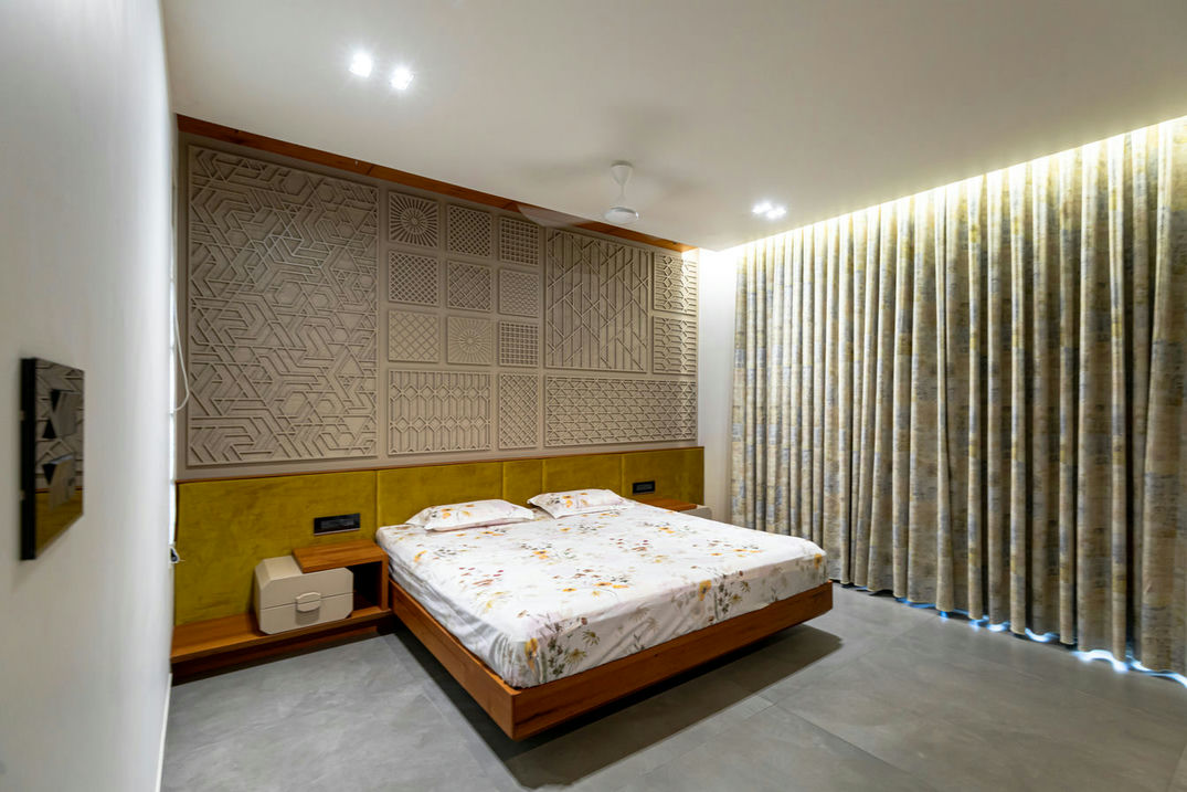 Stepping into yet another room reveals a striking composition. Cream colored walls enhanced with multifaceted detailing provide a backdrop to a well-designed space. The inclusion of a spacious walking closet adds an element of luxury, elevating the room's overall elegance. Fundamentally, Vinodbhai's house is a demonstration of the consistent combination of simplicity and sophistication, creating a truly captivating living space.
