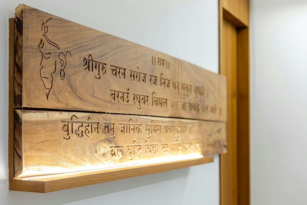 The first bedroom confers a sense of elegance with a wooden-framed Hanuman Chalisa shloka enhancing the wall. The overall ambiance is understated yet astonishing. Moving forward, a harmonious combination of light blue and beige hues in another room enhances the aesthetic appeal. This careful variety of colour scheme creates a visually pleasing environment adding to the home's general appeal.