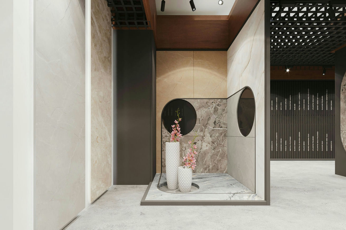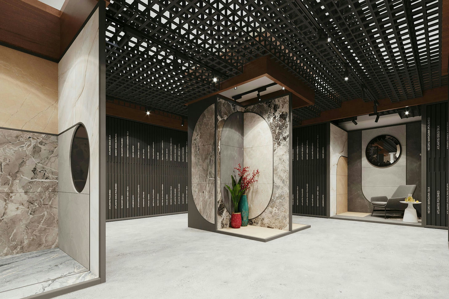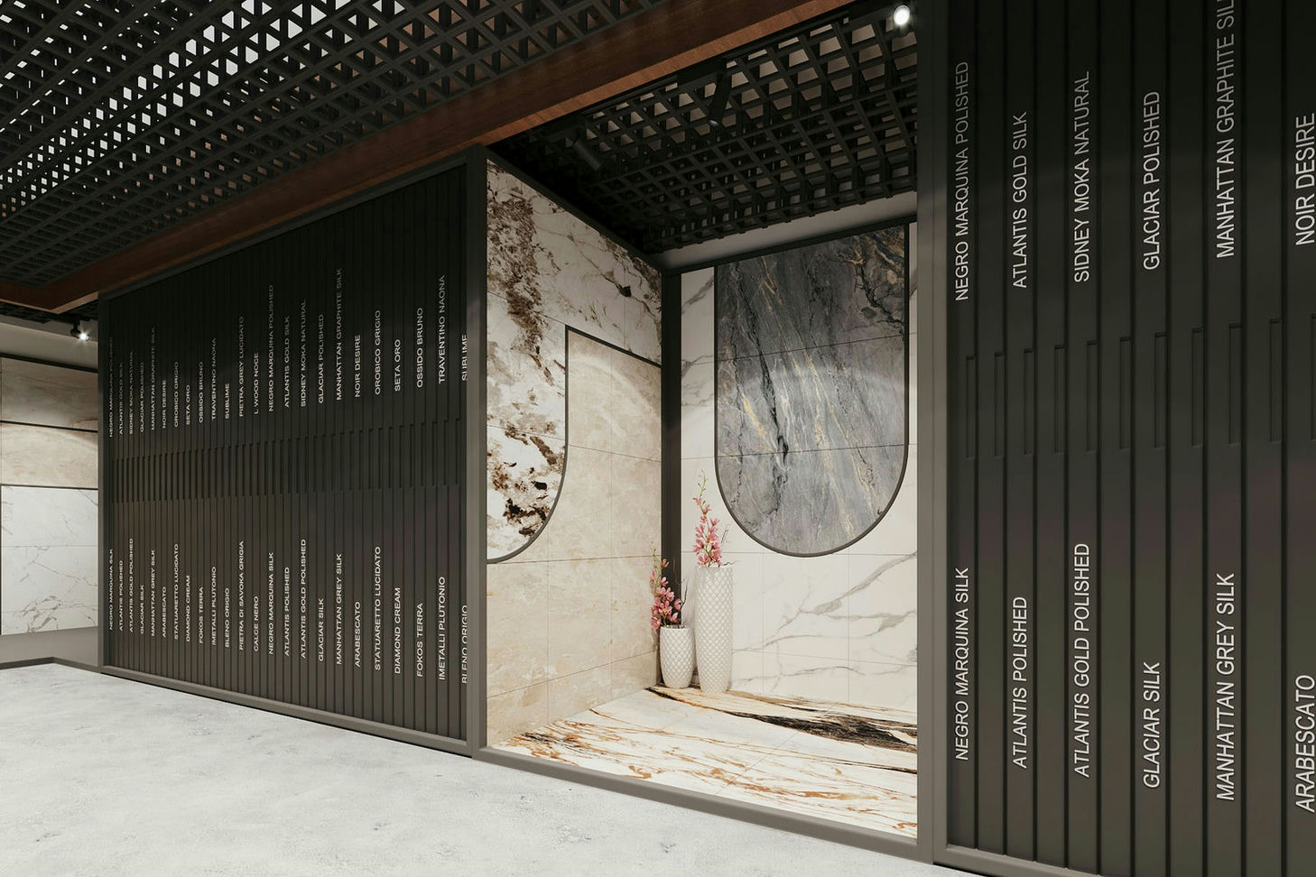 The stall was designed in Europe – with a minimal theme to display the big tiles- 1200 x 2800 and 800 x 3000. Keeping the panels simple and making an angular wall in the centre to create a stall welcoming the visitors. Entry with the V-shaped tile application to attract the stall from out and inside.