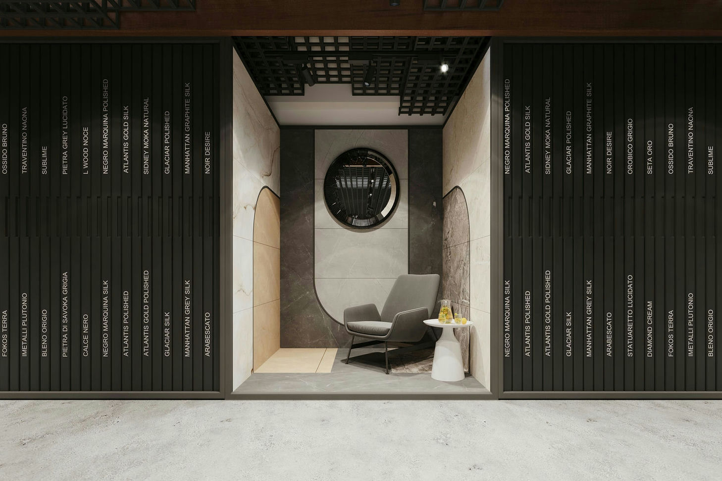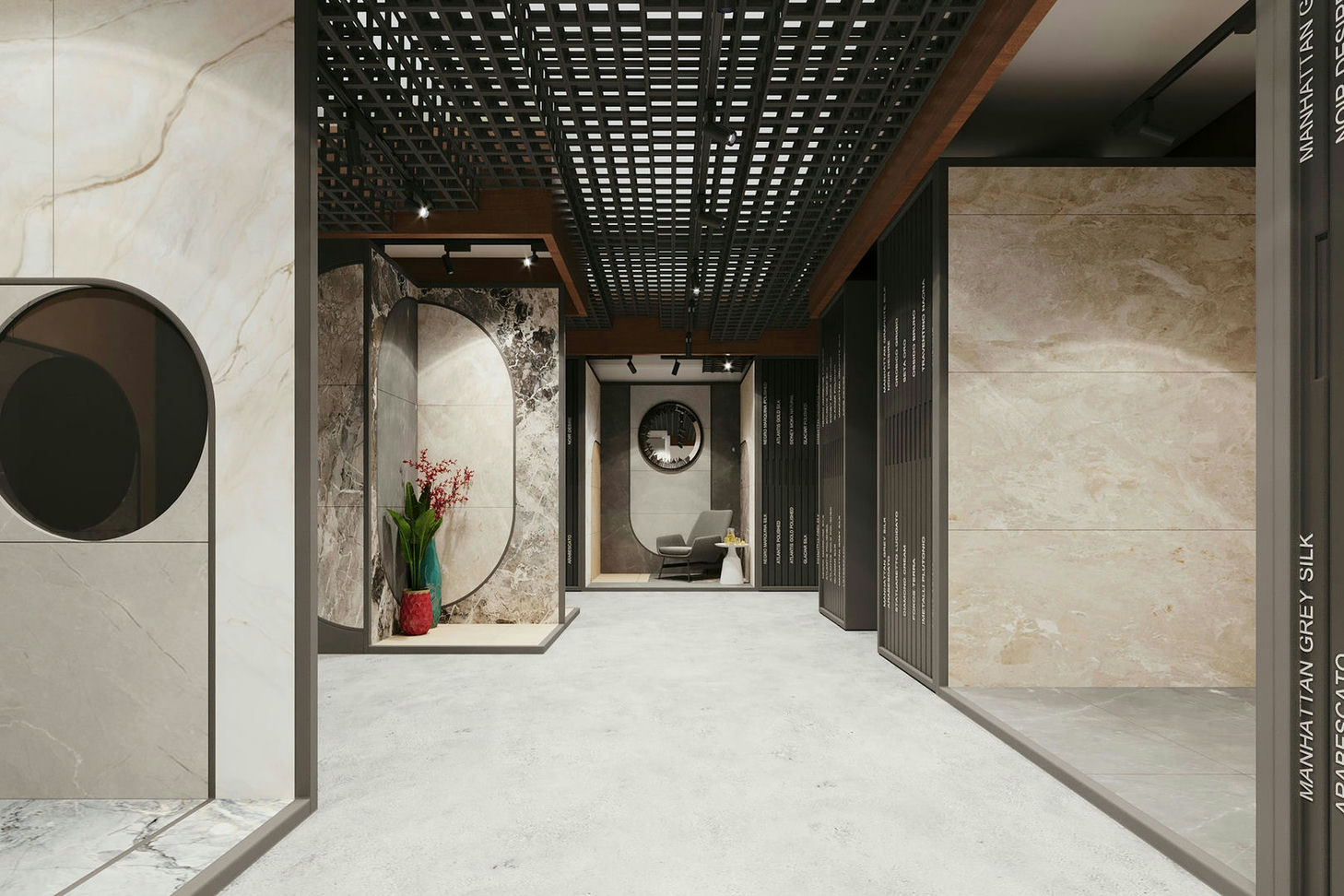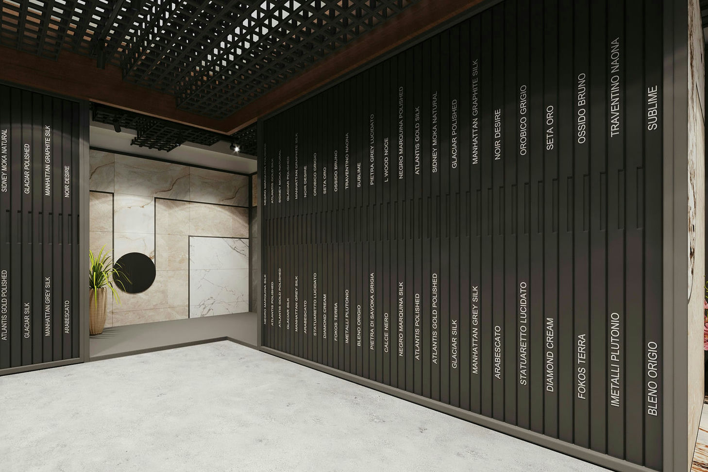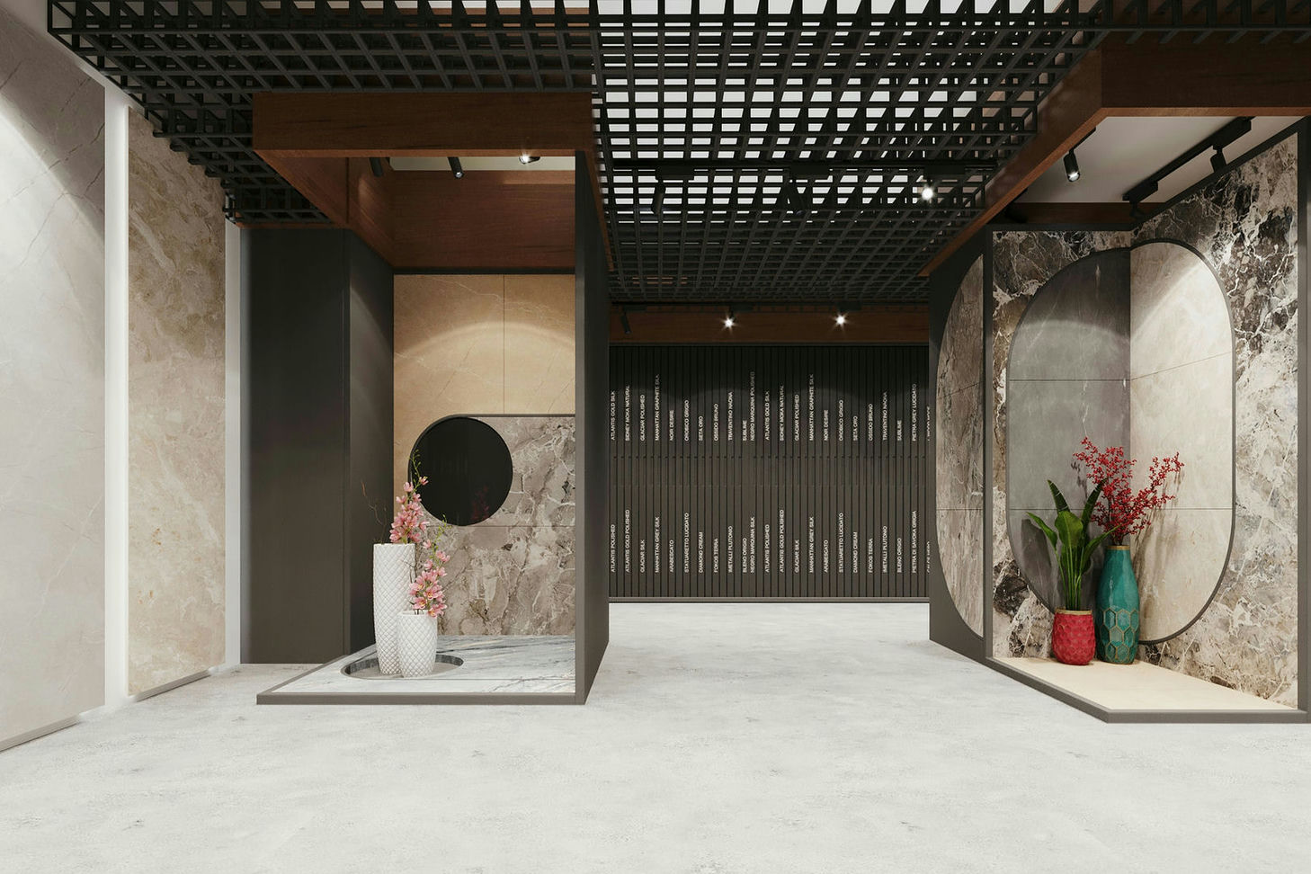 The stall was designed in Europe – with a minimal theme to display the big tiles- 1200 x 2800 and 800 x 3000. Keeping the panels simple and making an angular wall in the centre to create a stall welcoming the visitors. Entry with the V-shaped tile application to attract the stall from out and inside.