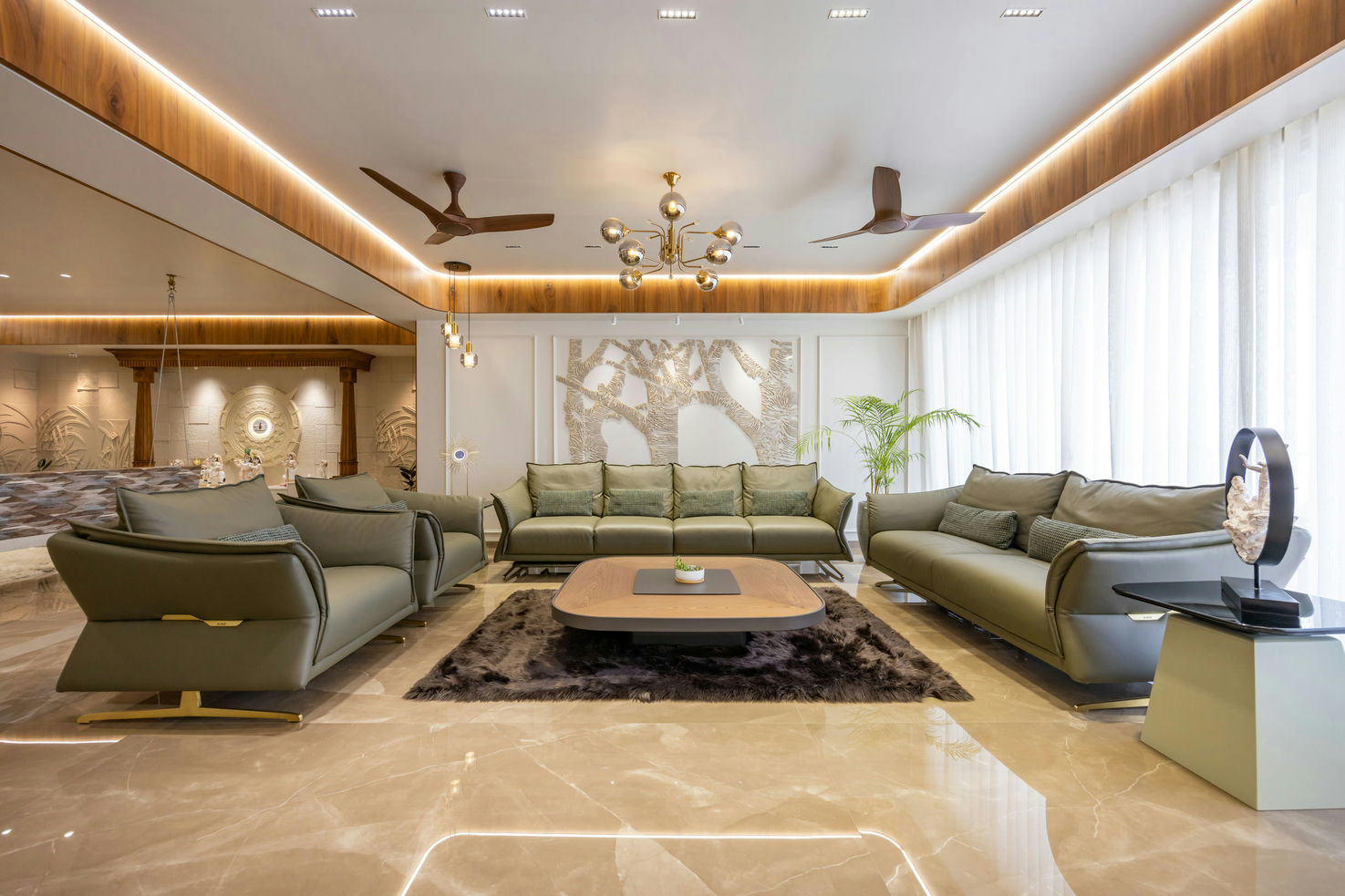 Inside, the Italian flooring with red aggregate stone sets a regal tone, creating a lavish yet classically traditional ambiance. One of the standout features is the bespoke puja room, a sacred space adorned with a mandir crafted from green Kota stone, pinle marble and mother of pearl stone. It is a demonstration to the intricate craftsmanship that mixes consistently with custom and traditions.