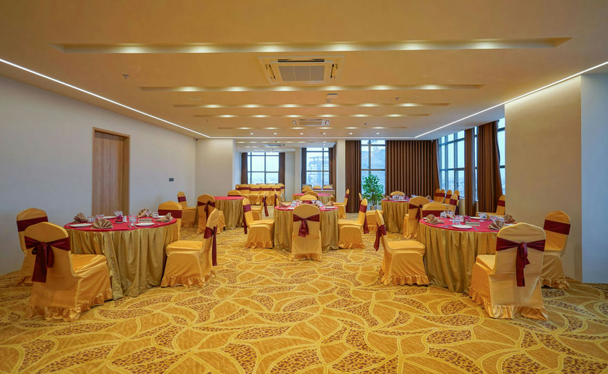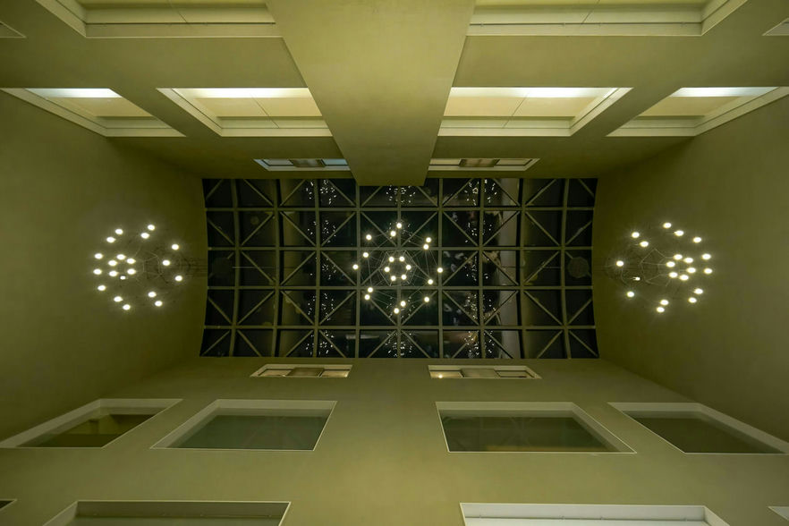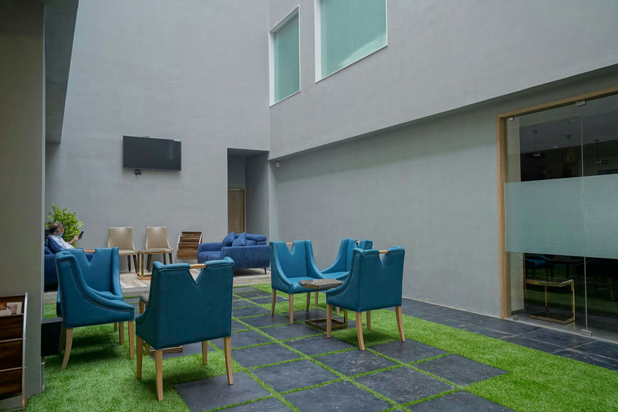 On tenth floor an entrance with a multifunctional reception, a welcoming central courtyard, waiting area with smart furniture and cozy seating, admin and utility blocks, a banquet of 200 individuals for gatherings
