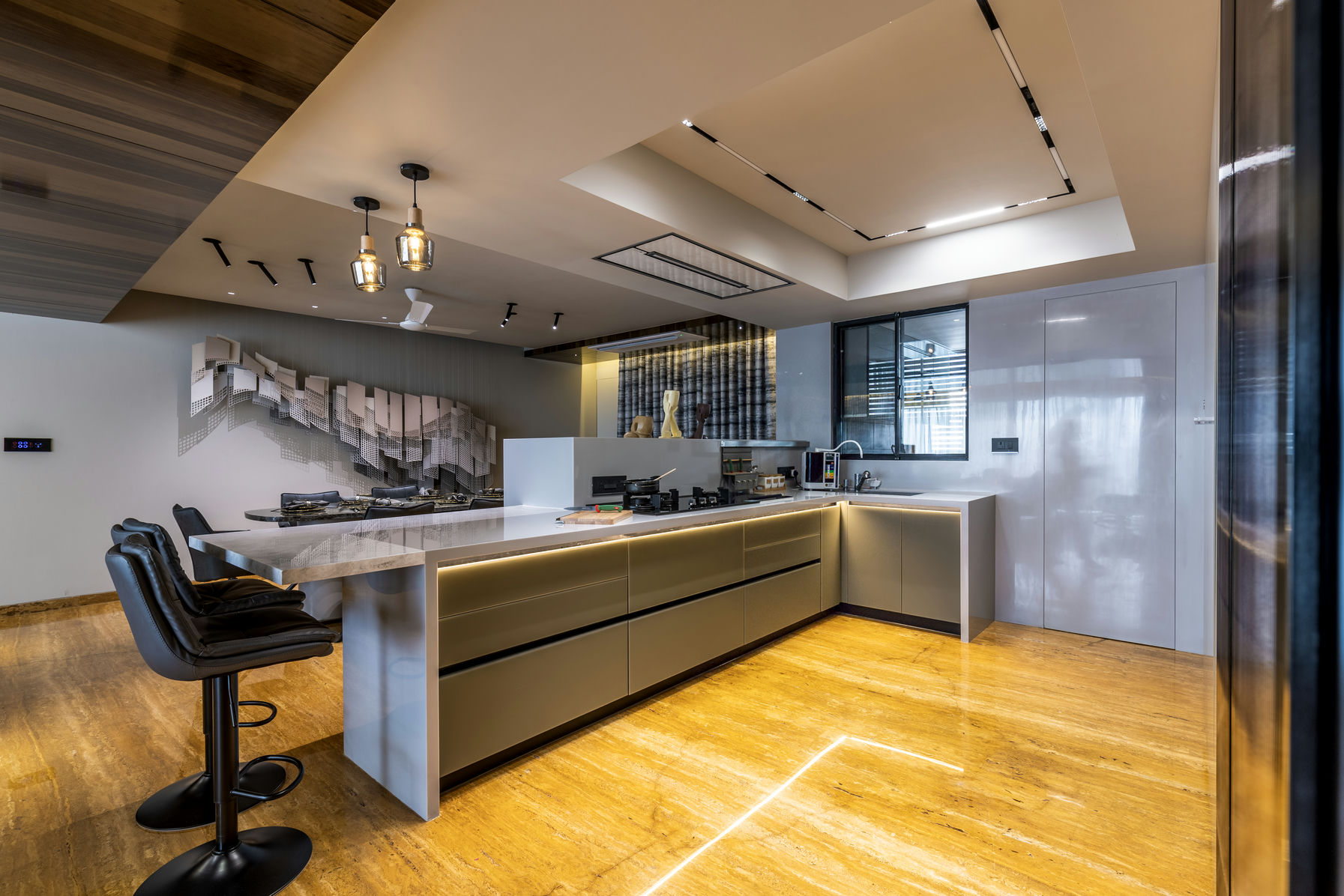 The foyer area set the subtle interplay of pattern of veneer with a soft touch of texture in wall continuing to the living area. Moving into the living area with white Italian tv backdrop adorned with delicate yellow golden strips adds a touch of elegance which beautifully gels with yellow Italian flooring. The dining space centers around a black Italian with a string art which upholds the beauty of the house. The open kitchen concept with soft pastel tone of green, designed for functionality as well as offering ample storage and ease of maintenance.
