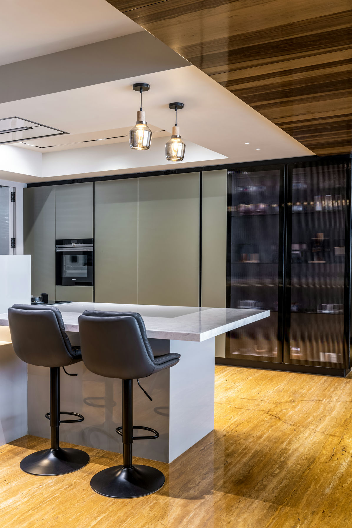 The master bedroom with soothing shades of blue and grey covers the space with custom headboards, seamless wardrobe and flushed door. The daughter room radiates warmth with the palette of green and wine, with custom wallpaper evoking an empowerment vibe. Continuing with other room featured with panels of art and rhythmic lines with the built-in wardrobe and a sleek study table with a soft touch of corian. A neutral and natural palette of wood, stone and fabric creates a minimal backdrop to every space, which provides a sense of comfort and luxury.