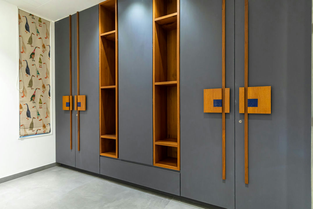 Stepping into yet another room reveals a striking composition. Cream colored walls enhanced with multifaceted detailing provide a backdrop to a well-designed space. The inclusion of a spacious walking closet adds an element of luxury, elevating the room's overall elegance. Fundamentally, Vinodbhai's house is a demonstration of the consistent combination of simplicity and sophistication, creating a truly captivating living space.