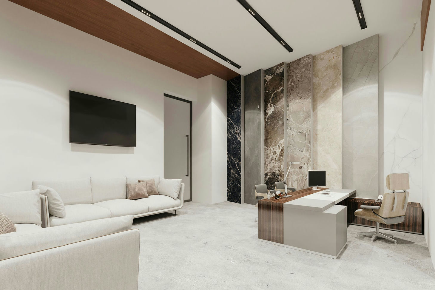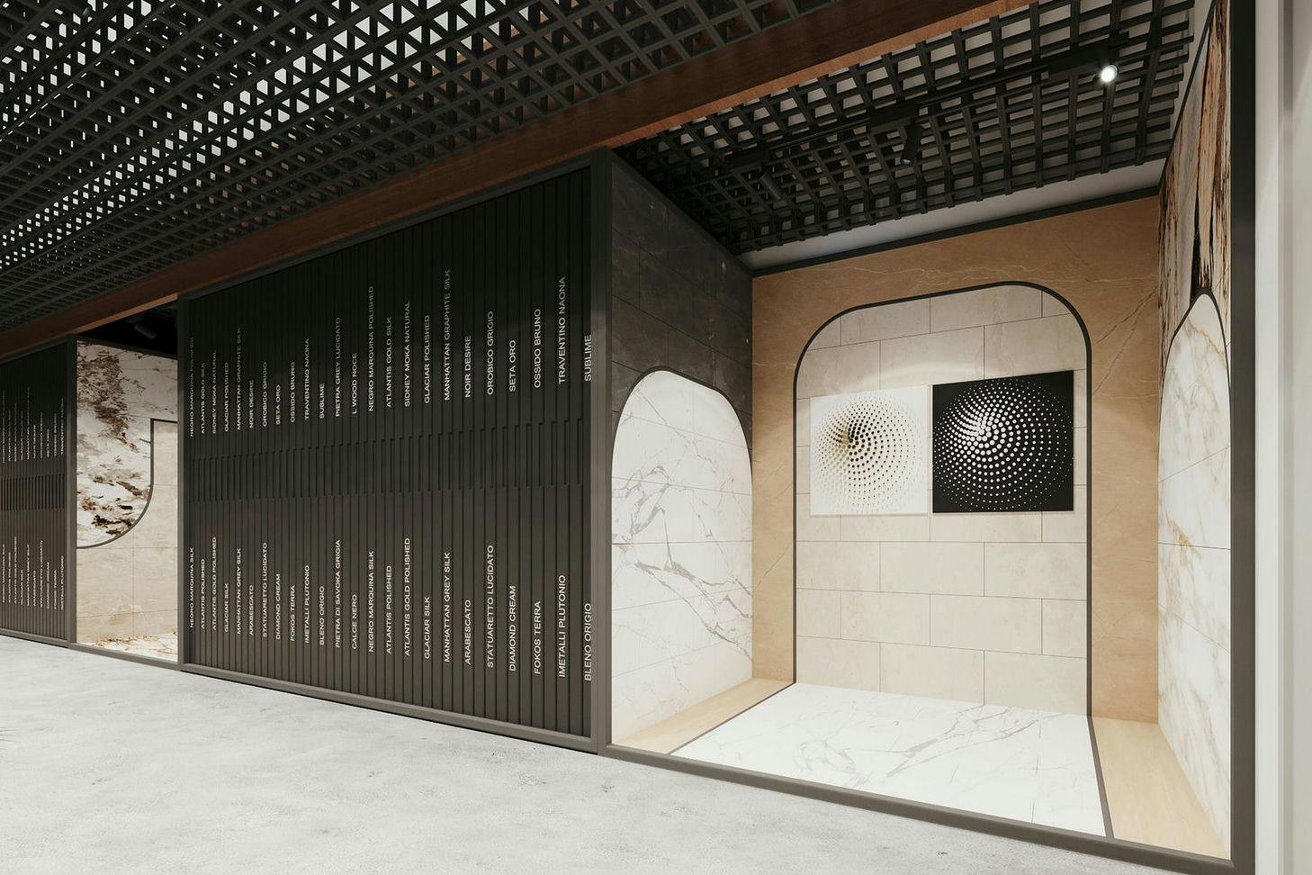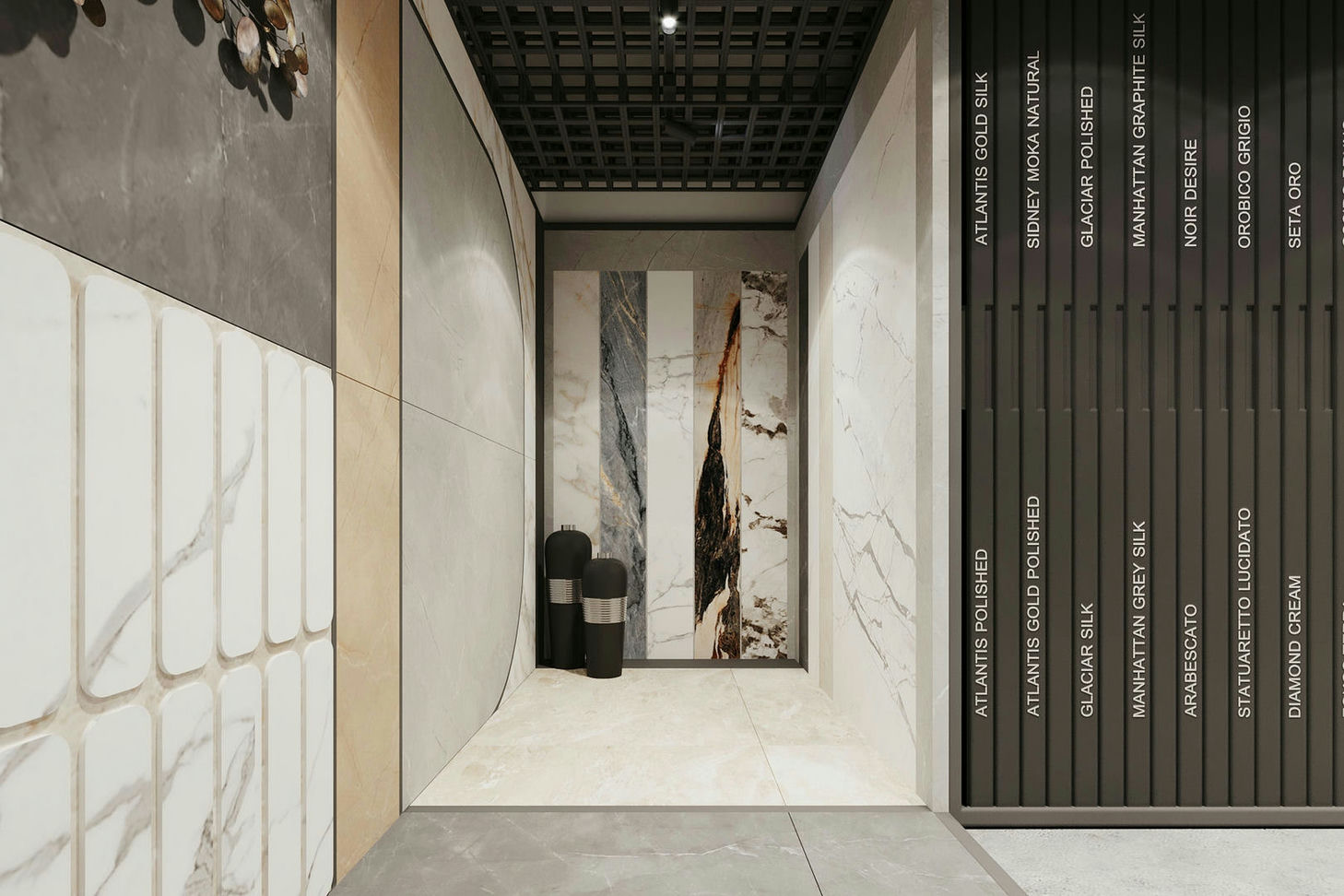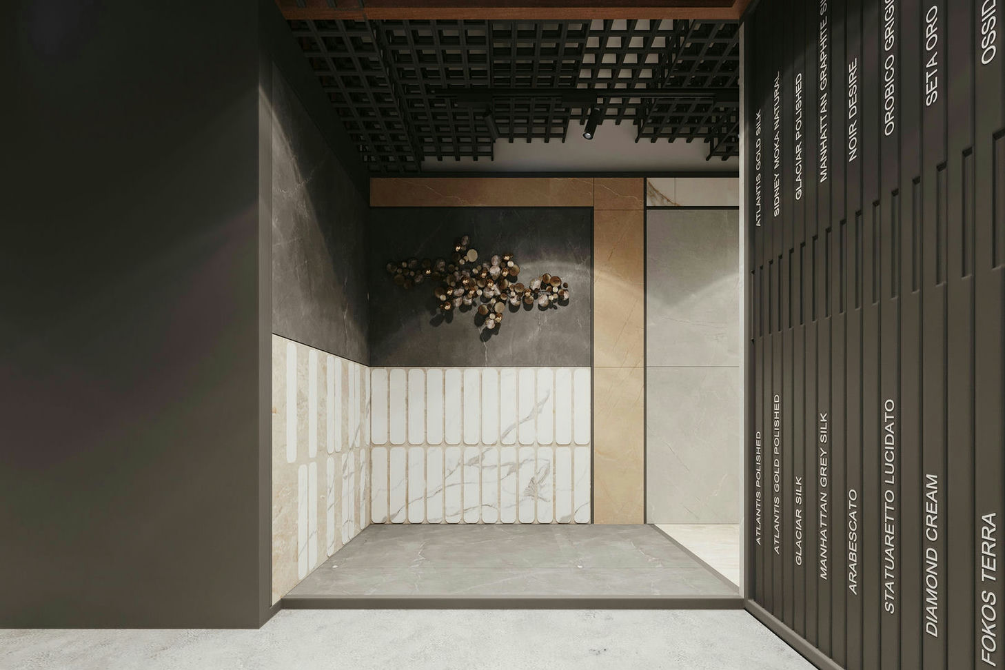 The stall was designed in Europe – with a minimal theme to display the big tiles- 1200 x 2800 and 800 x 3000. Keeping the panels simple and making an angular wall in the centre to create a stall welcoming the visitors. Entry with the V-shaped tile application to attract the stall from out and inside.