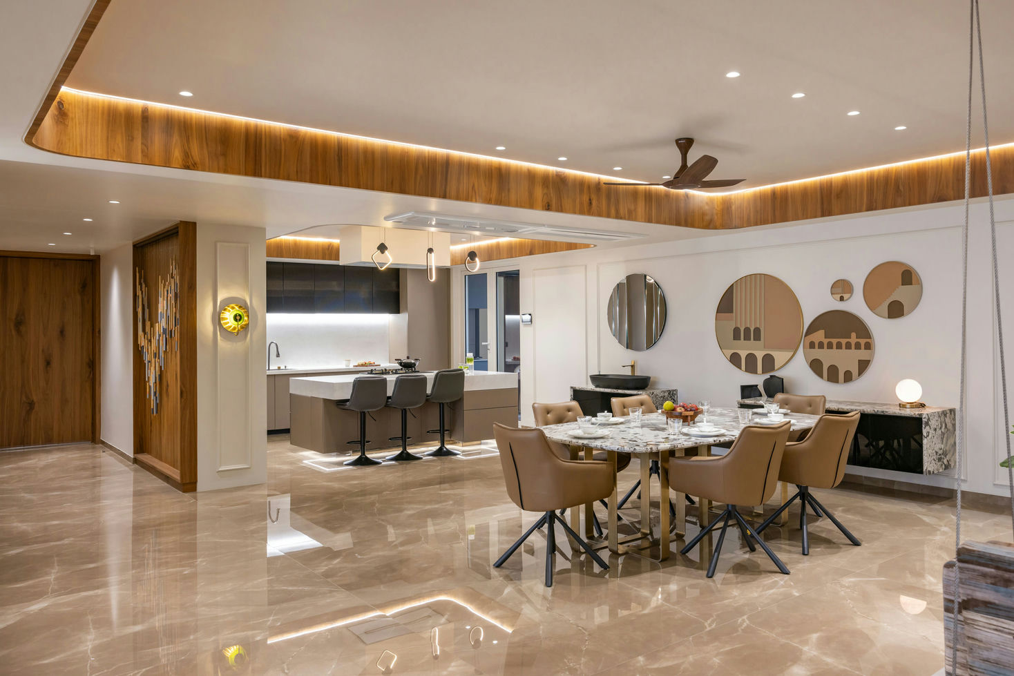 Inside, the Italian flooring with red aggregate stone sets a regal tone, creating a lavish yet classically traditional ambiance. One of the standout features is the bespoke puja room, a sacred space adorned with a mandir crafted from green Kota stone, pinle marble and mother of pearl stone. It is a demonstration to the intricate craftsmanship that mixes consistently with custom and traditions.